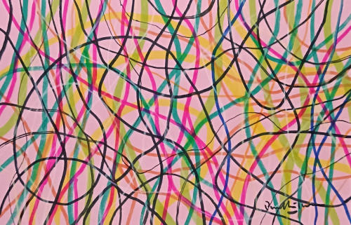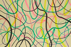 The paintings feature a series of curvy lines of varying colours