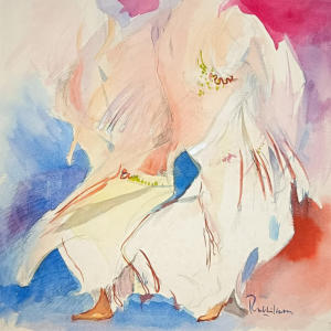 the painting, a delicate wash of light orange creates a subtle